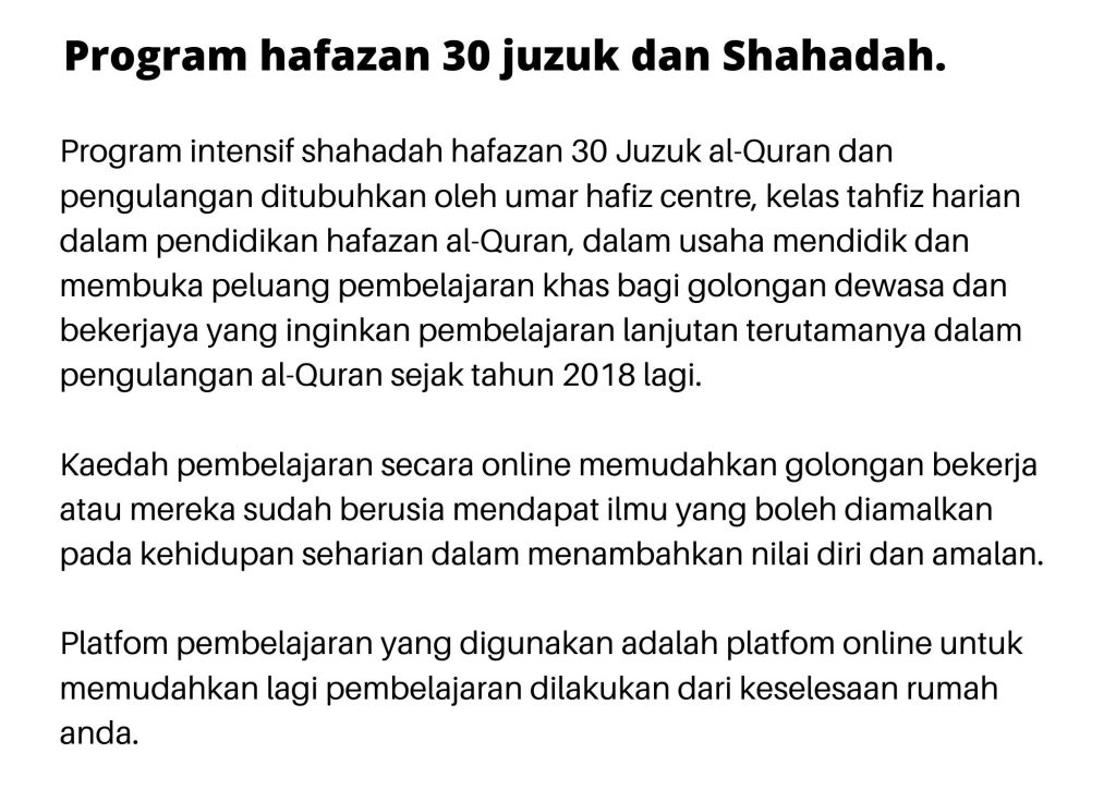 “Alhamdulillah , best sangat dapat belajar hafazan bersama Umarhafiz centre 🥰 mudah faham dan ingat , guru pun best sangat 😍” – Pn. Afilla , Gombak